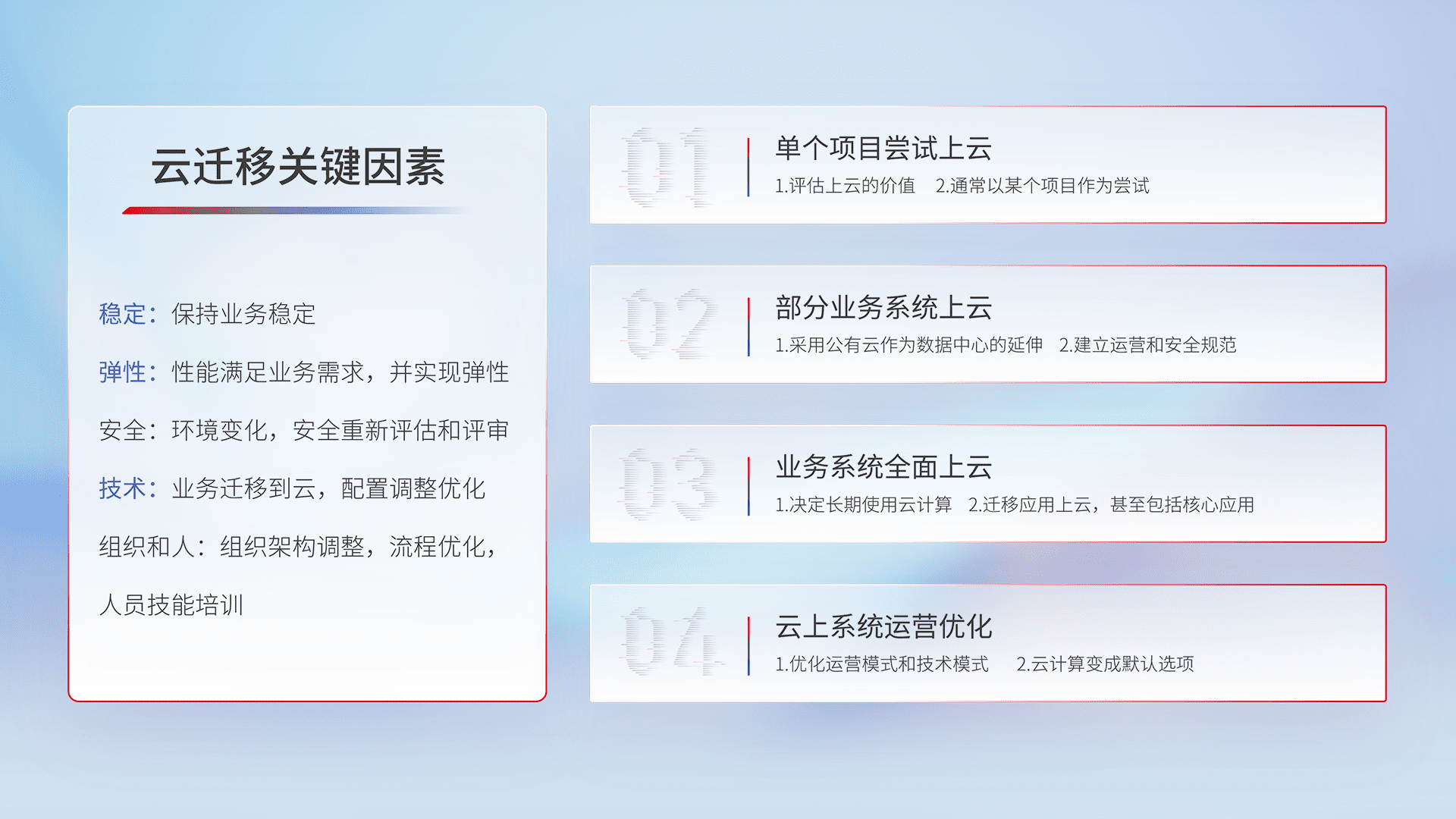 结合实际业务,,,,从规划设计、、云平台选型、、、云原生改造、、、数据迁移、、集成交付,,,,迁移全过程为客户识别最佳上云路径,,,,做好风险识别管理,,,设计网络架构、、、身份权限、、、、安全审计合规、、、、操作审计、、日志审计、、、监控告警策略、、、多站点容灾设计等,,,对云上基础设施进行整体规划,,提升IT治理水平,,以满足弹性、、、高可用、、、、高性能的需求。。。